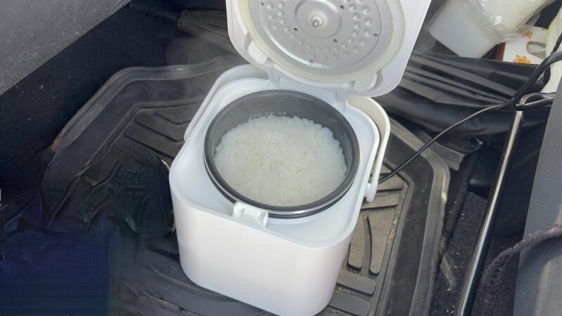 ポータブル電源につないで、お昼に炊き上がるようタイマーをセットするだけです。